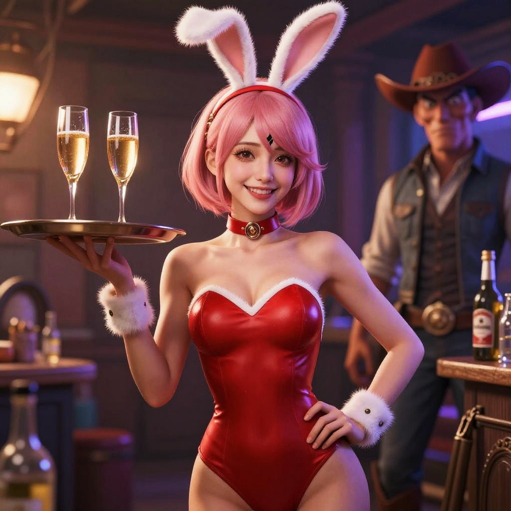 Masterpiece, absurdres, (intricate details), (colorful), cinematic lighting, bust shot, extremely detailed CG unity 8k wallpaper, 1girl, haruno sakura, forehead mark, fake animal ears, choker, swimsuit, red leotard, playboy bunny, tray, champagne, smile, looking at viewer, cowboy shot