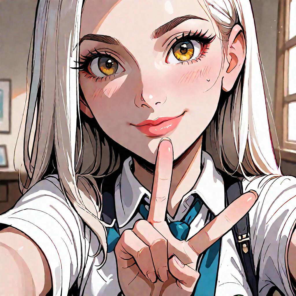 Score_9, score_8_up, score_7_up, score_6_up, score_5_up, score_4_up, source_anime, solo, 1girl, smile, adorable face, cute, long eyelashes, elbow out of frame, one hand out of frame, necktie, selfie, closeup, recording, pov, v sign, upper_body