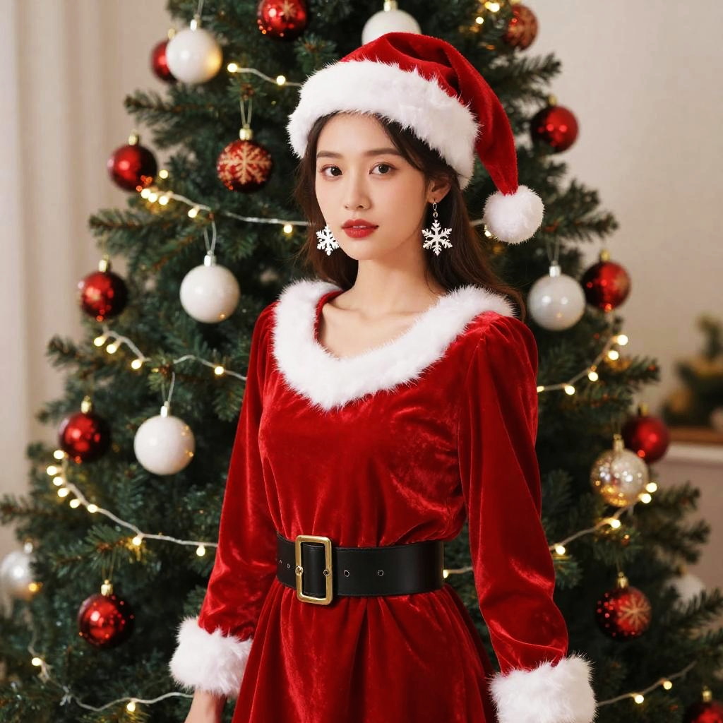 A woman dressed in a festive red velvet Christmas outfit with white fur trim and a black belt stands in front of a decorated Christmas tree adorned with red and white ornaments and warm string lights. She wears a Santa hat and snowflake-shaped earrings, embodying a classic holiday style with a cozy, elegant feel.