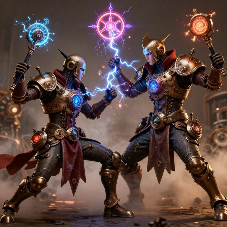 Arcanepunk duel between two mage-engineers, sparks of electricity and glowing arcane symbols, steampunk weaponry fused with elemental magic, dynamic action pose, smoky background, rich color palette