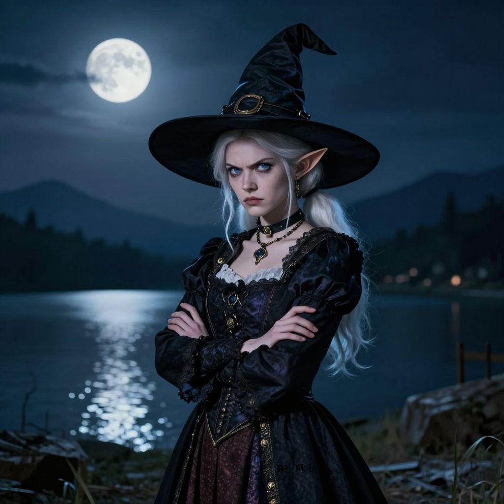 1girl, standing, crossed arms, (full body:1.2), blue eyes, (angry:1.3), (smirk), pointy ears, (witch), white hair, ponytail, (witch hat:1.3), jewelry, choker, antique clothes, lake and mountains in background, (night time sky:1.3), (moonlight:1.3), (in style of caravaggio:.8), (masterpiece:1.2), (sharp:1.2), (qood quality:1.2), (RAW), (8K), (detailed), (photorealistic)