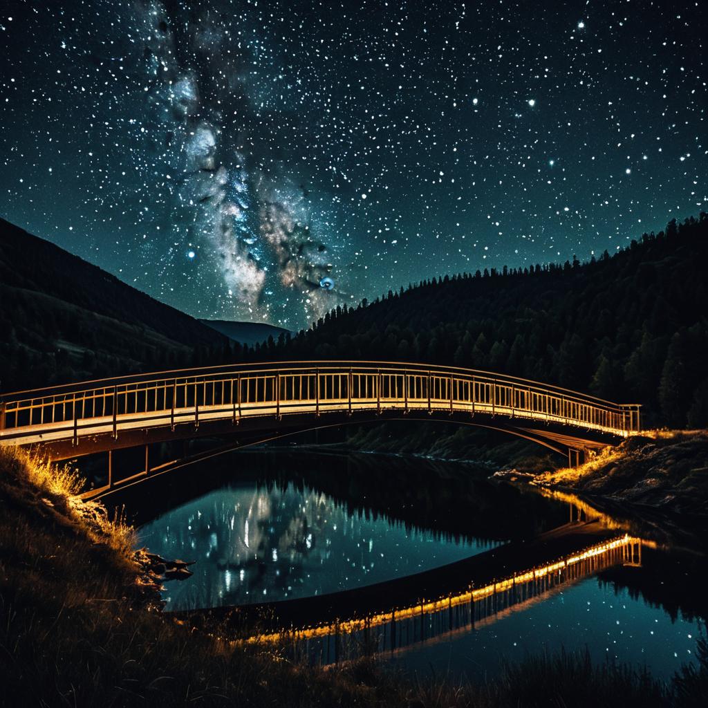 Valley A bridge by a lake at night, in the style of Transcendentalism, lavender and deep green, captivating lighting, glazed surfaces, impressionism, creative commons attribution: sky full of blazing stars