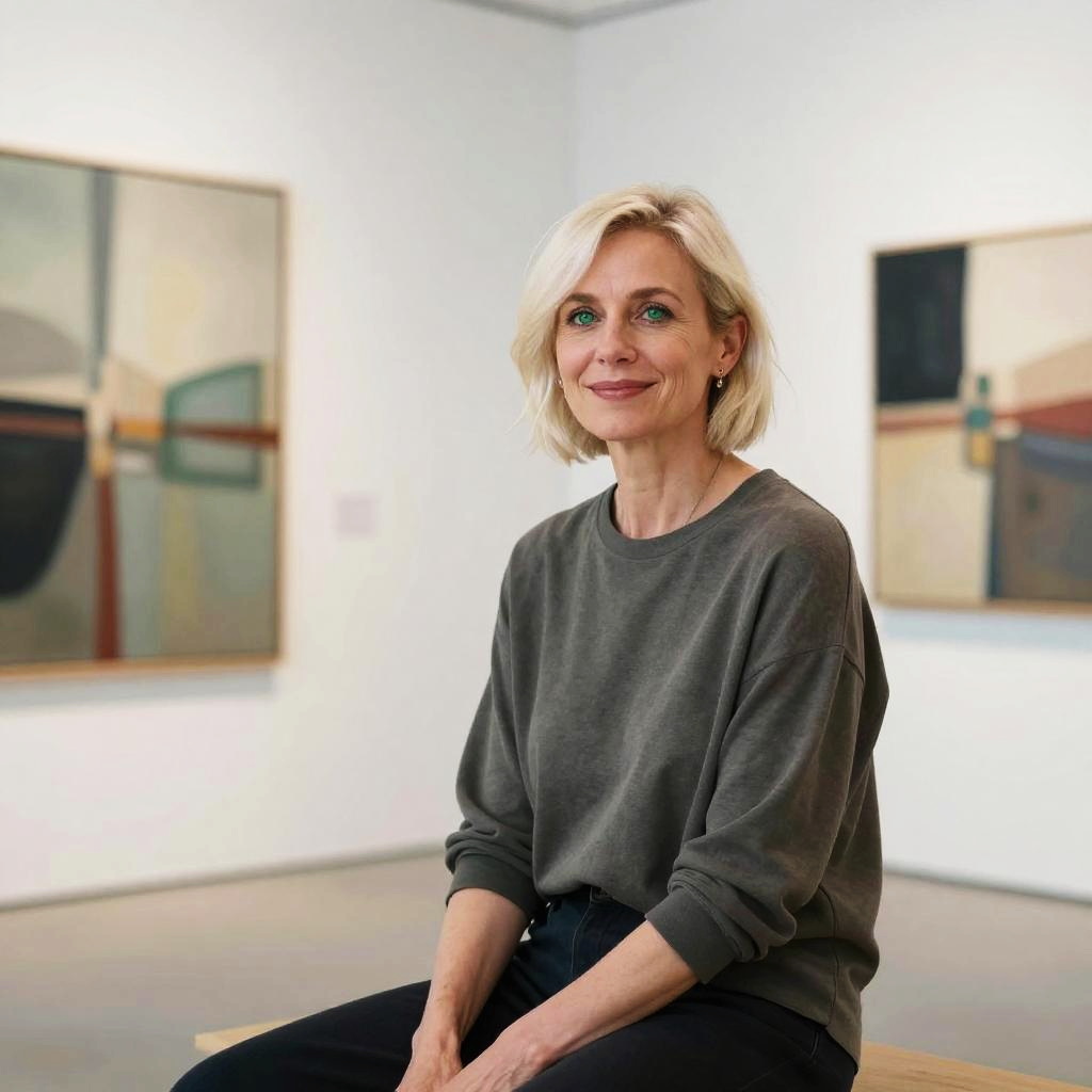 Photograph of a middle-aged woman with long straight blonde hair and light skin, contemplative gaze in modern art gallery with white walls and soft natural light. They wear a tailored navy blue blazer paired with a silk ivory blouse and minimal jewelry. Soft, cinematic key with subtle rim highlights facial structure and reveals fabric texture; shallow depth of field, high-fashion editorial mood, crisp detail, cool palette, balanced framing.