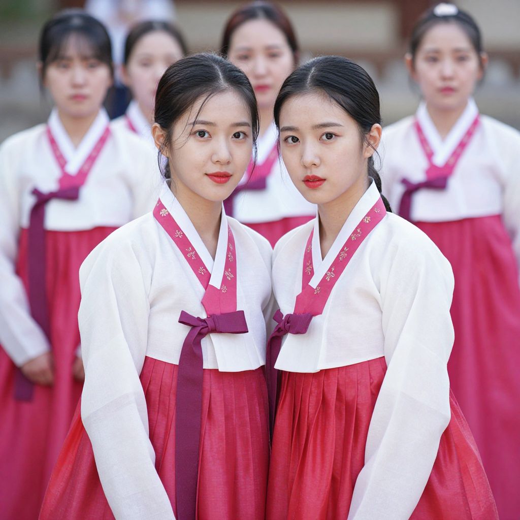 Photograph of five young Asian women standing outdoors, wearing traditional Korean hanbok attire. The two women in the foreground are closely positioned, both with straight black hair tied back and red lipstick. They wear white long-sleeved tops with red sash-like ties and red pleated skirts. The three women in the blurred background also wear similar hanbok. The background includes a blurred wooden structure, suggesting an outdoor setting. The image has a sharp focus on the two women in the foreground, highlighting their clear expressions and detailed clothing. The overall color palette is dominated by white, red, and natural wood tones.