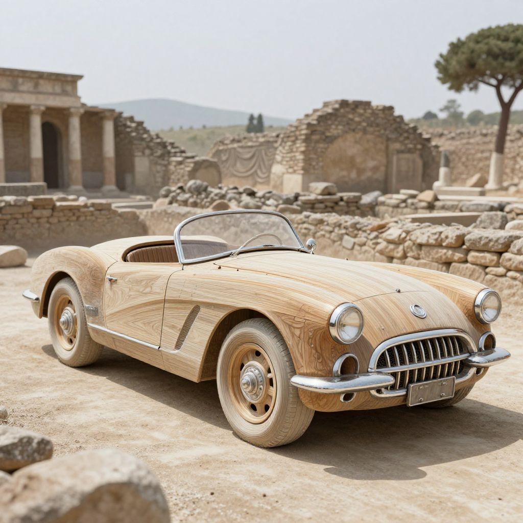 Chalk an ancient Chevrolet Corvette being excavated from a Roman ruin. The car is made out of wood.,