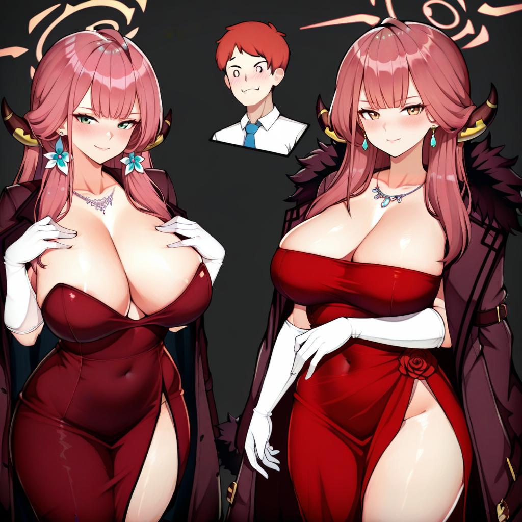 Aru (dress) (blue archive), blue archive, 1girl, demon horns, brown horns, yellow eyes, pink hair, long hair, red hair, large breasts, cleavage, collarbone, red dress, white gloves, coat on shoulders, strapless dress, elbow gloves, red coat, jacket on shoulders, halo, pink halo, earrings, necklace, side slit, by artist varniskarnis, illustrious