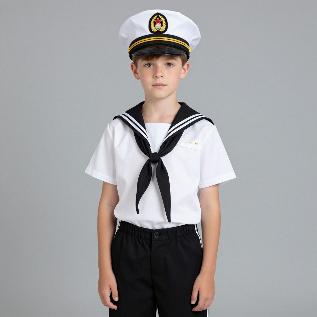 American navy costume, 1boy, male focus, solo, hat, sailor hat, realistic, shirt, pants, white shirt, sailor collar, black pants, sailor, grey background, simple background