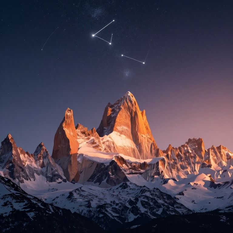 Photograph of a stunning mountain range at sunset, with jagged peaks bathed in warm orange and pink light. Snow blankets the lower slopes, contrasting with the dark, rocky surfaces. The deep blue to purple gradient sky is dotted with stars, and two bright stars form a constellation line above the peaks. The Milky Way is faintly visible in the upper center. The texture of the mountains is rugged and sharp, with the sunlight highlighting their contours. The overall scene evokes a sense of majestic beauty and serenity in a remote, high-altitude landscape.