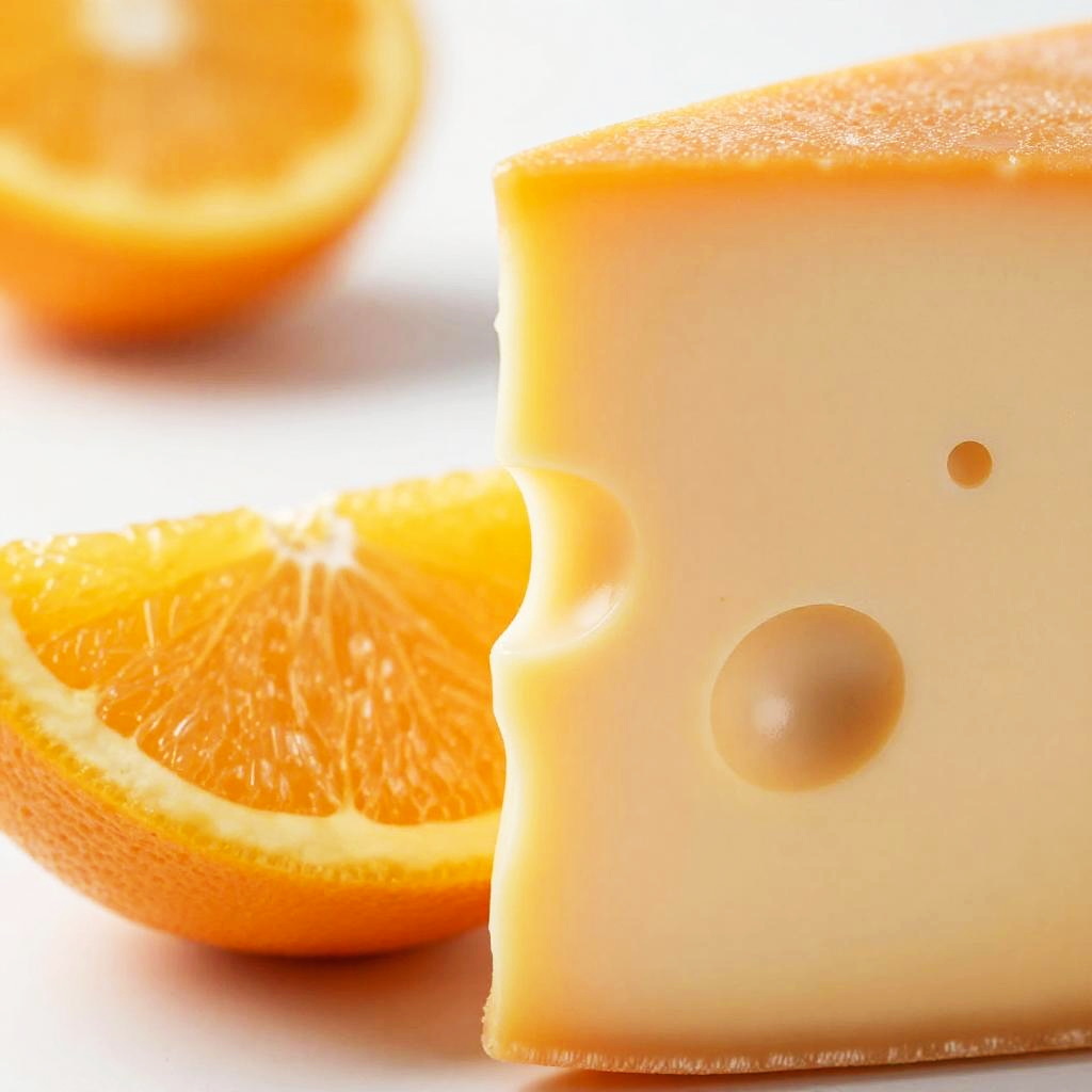 Photograph of a close-up scene featuring a wedge of bright orange-orange citrus fruit and a square piece of Swiss cheese with large, round holes. The cheese is positioned on the right, displaying a creamy yellow color with a smooth texture. The orange wedge is on the left, showcasing its vibrant, juicy interior and slightly textured rind. The background is softly blurred, highlighting the sharp contrast between the orange's bright color and the cheese's pale hue. The image emphasizes the textures and colors, with the orange's juicy pulp and the cheese's smooth, hole-ridden surface.