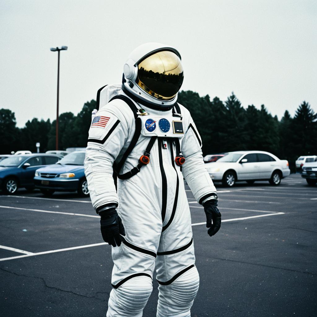 Photograph of an astronaut in a white spacesuit standing in a parking lot. The suit features black trim, an American flag patch on the right shoulder, and a NASA logo on the chest. The astronaut's gold-tinted helmet visor reflects the overcast sky. Background includes several parked cars, including a blue sedan and a white car, and a row of dark green trees. The asphalt parking lot has visible white lines. The image has a slightly desaturated, almost comic-book-like color style.