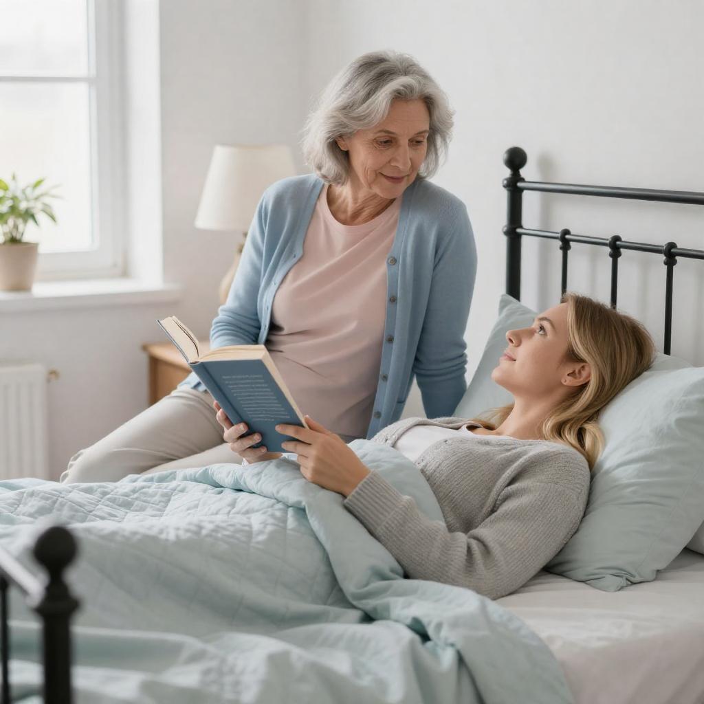 Two elderly women with curly short hair and gray hair wearing black tops sit at a wooden table in a naturally lit room. One woman is reading a book while the other attentively looks on. The setting includes a large window, brown leather chairs, a glass vase with dried plants, an overhead industrial-style lamp, and a framed picture on the wall.