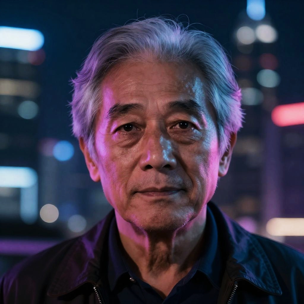 Photograph of an older Asian man with gray hair, dimly lit by city lights, wearing a black jacket, with a neutral expression. Urban night