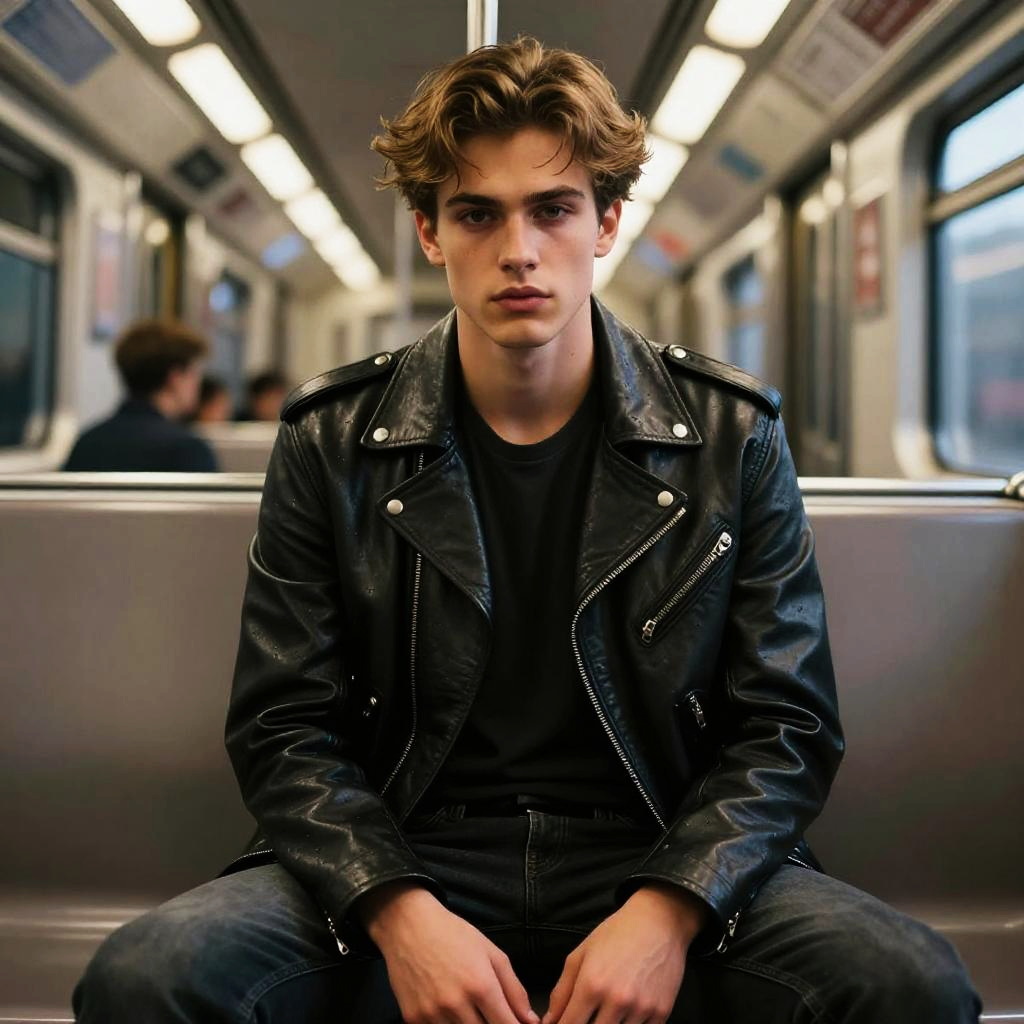 (masterpiece:1.1), best quality, (photorealistic:1.2), hyperrealistic, award-winning portrait of young man, dark blonde hair styled back, determined expression, upper body, expressive eyes, slim wai BREAK 1.1, narrow hips:1.0, athletic-curvy build, wind-swept hair, sitting in empty subway car with soft neon lighting, wearing black leather jacket and dark jeans, golden hour glow, dappled light, soft particles in the air, 8k, highly detailed, broad lighting, chromatic aberration, subtle film grain, ray tracing, octane render, soft bloom