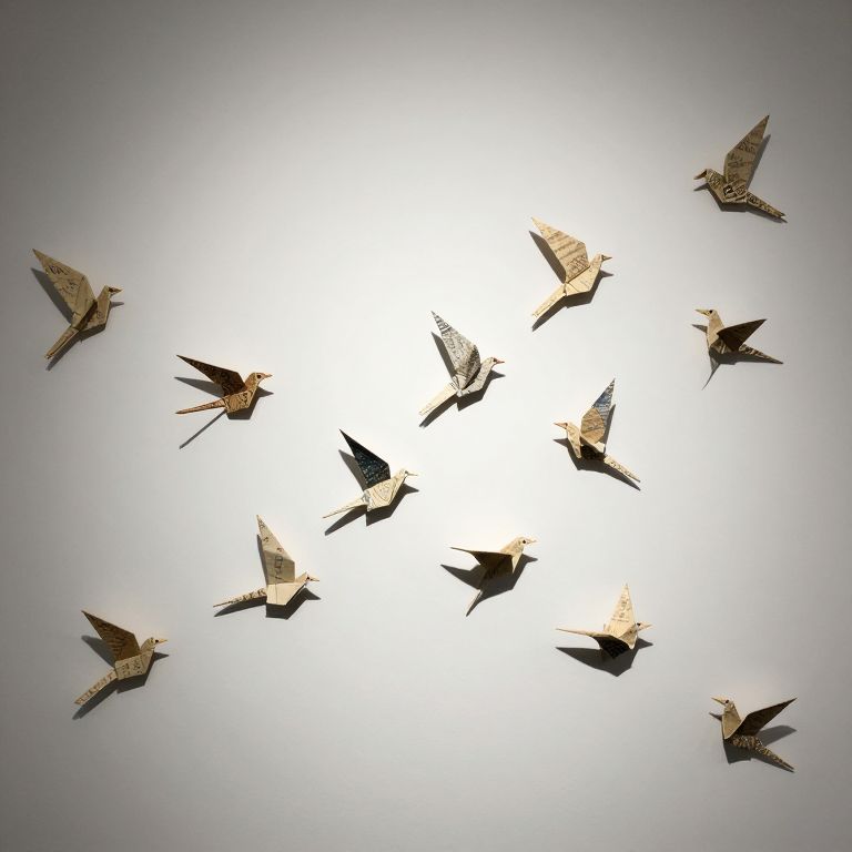 A dynamic installation of intricately crafted origami birds, fashioned from recycled paper with visible text and patterns, gracefully migrates across a minimalist wall, evoking themes of nostalgia and unspoken emotions through its delicate, three-dimensional artistry.