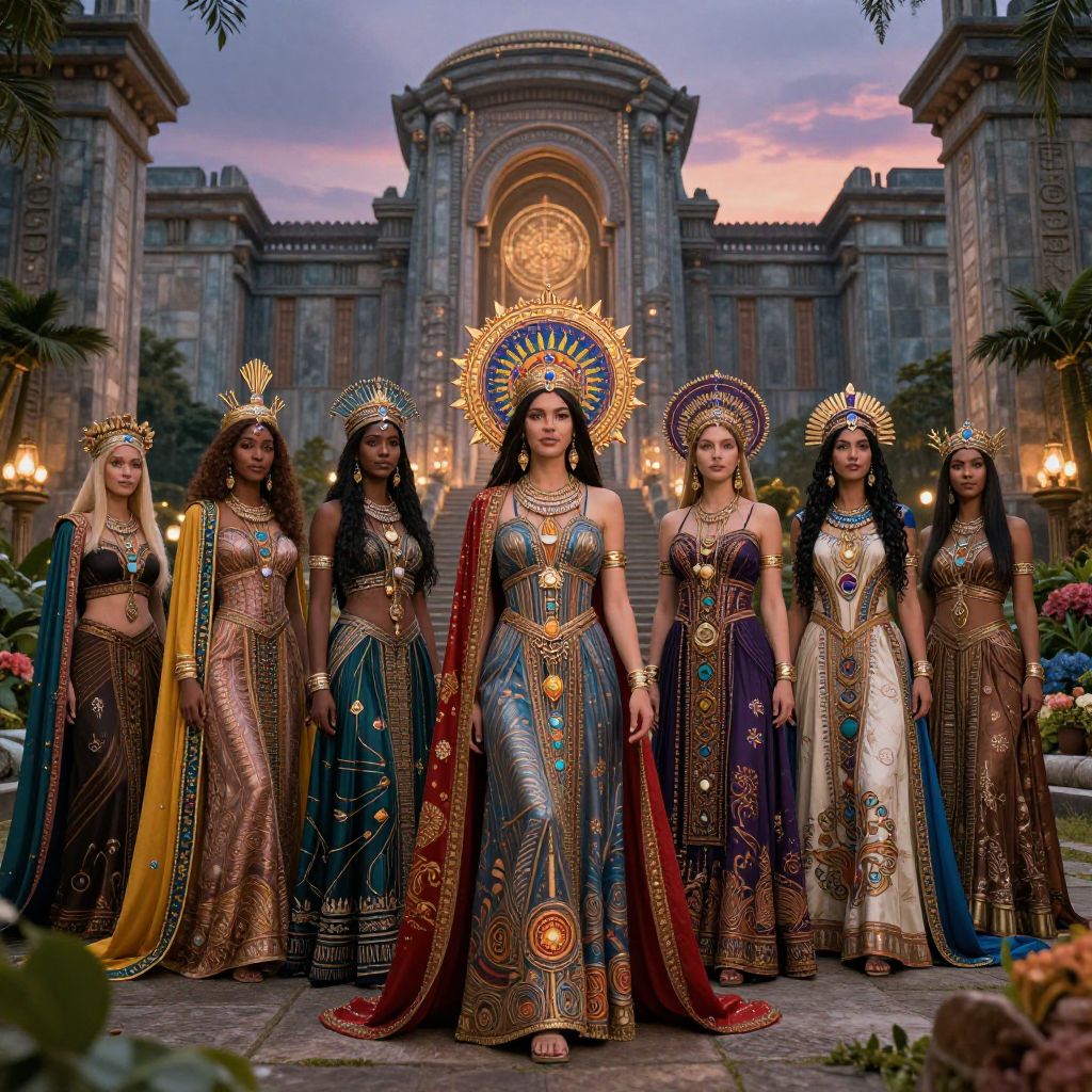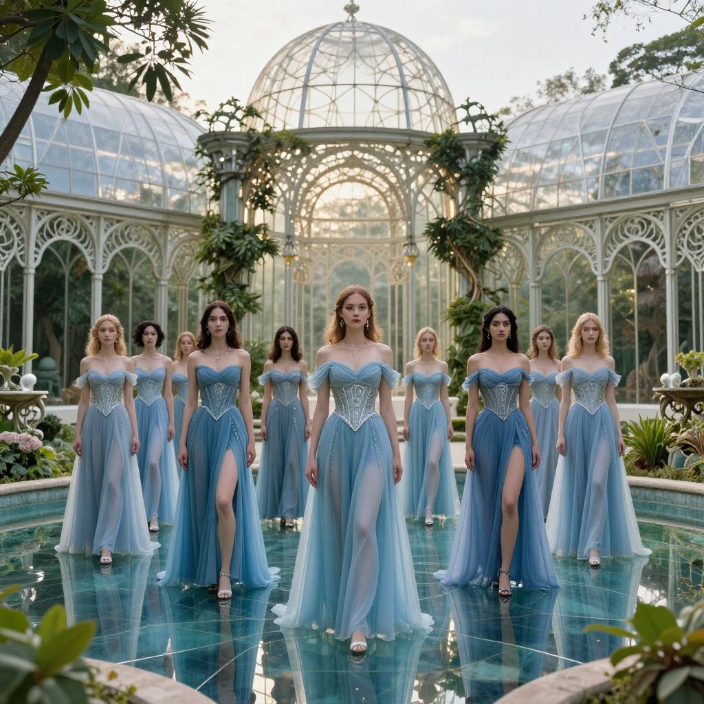 Twelve ethereal women dressed in flowing, elegant blue gowns with corset details stand gracefully in a reflective pool within an ornate crystal palace garden. The scene is set during golden hour, featuring a blend of art nouveau and biomechanical surrealism influences, surrounded by rich greenery and intricate architectural elements.