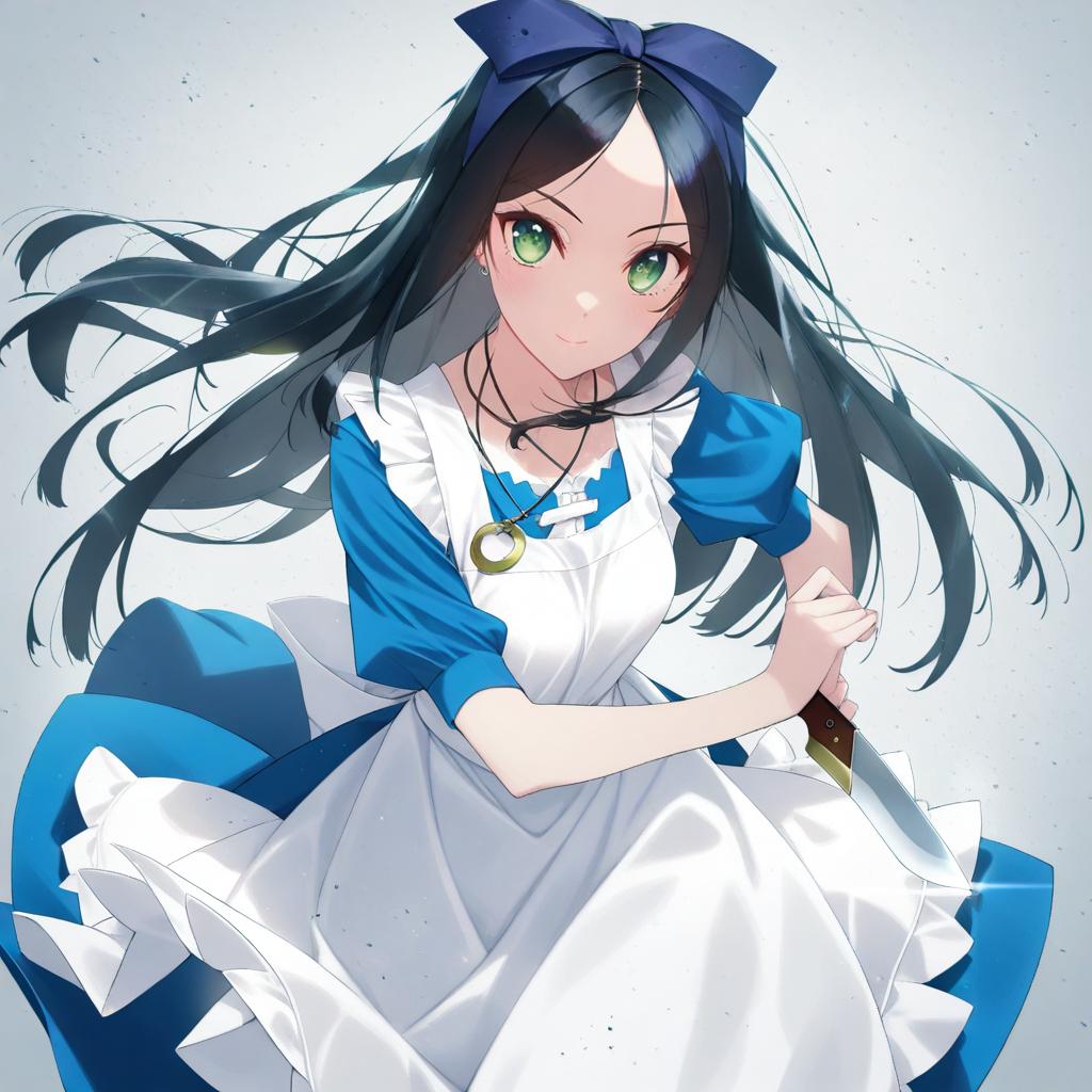Anime-style digital illustration of a girl with long black hair and green eyes wearing a blue dress and white apron. She has a blue bow on her head and wears a round pendant necklace. The character, inspired by Alice Liddell from American McGee's Alice, is holding a knife in one hand and has a determined expression. The artwork features detailed shading and dynamic flowing hair.