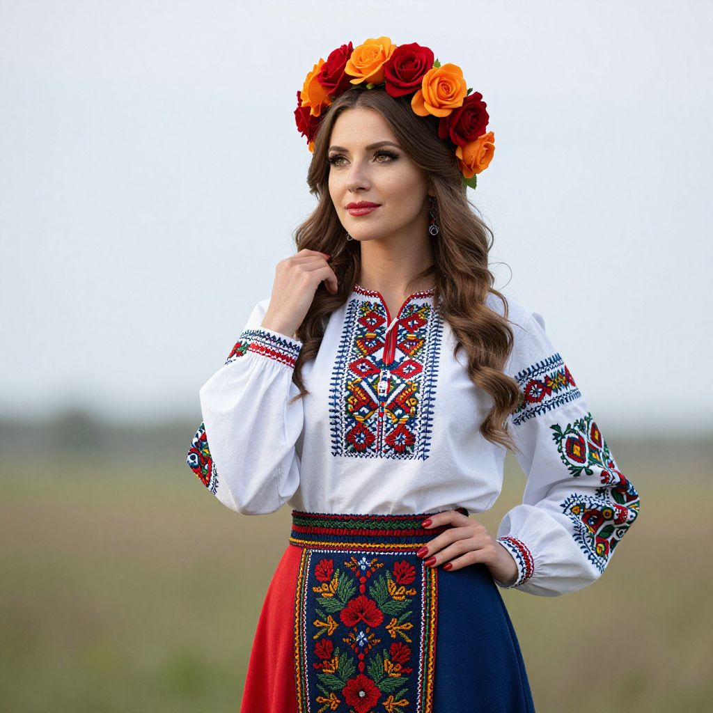 Woman wearing a vibrant Ukrainian folk-inspired dress with intricate embroidery, complemented by a floral crown of red and orange roses, stands gracefully in a serene field.
