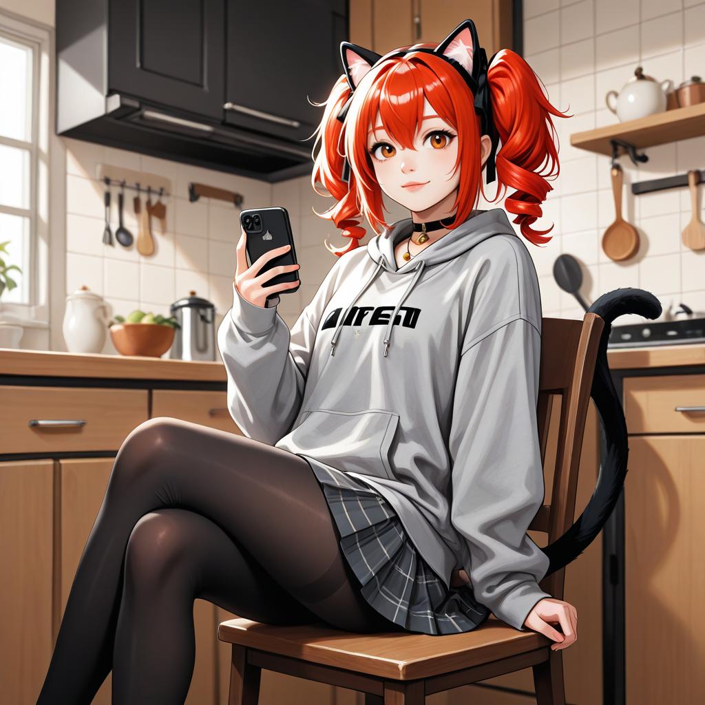 Feet out of frame, adachi rei, 1girl, red hair, twin drills, red eyes, cat ears, cat tail, grey hoodie, pleated skirt, black pantyhose, holding phone, smile, indoors, elated, warm kitchen, overexposed flash, choker necklace
