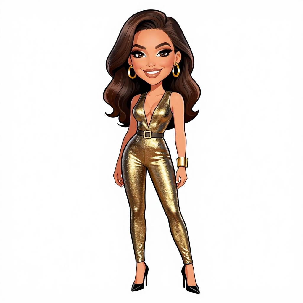 Woman with pretty face and pretty hair. smiling Woman, glam, sleeveless metallic jumpsuit in a shimmering gold, plunging neckline, cinched waist, slim-fit leg, black pointed stiletto heels, statement gold cuff bracelet. --sref 1467