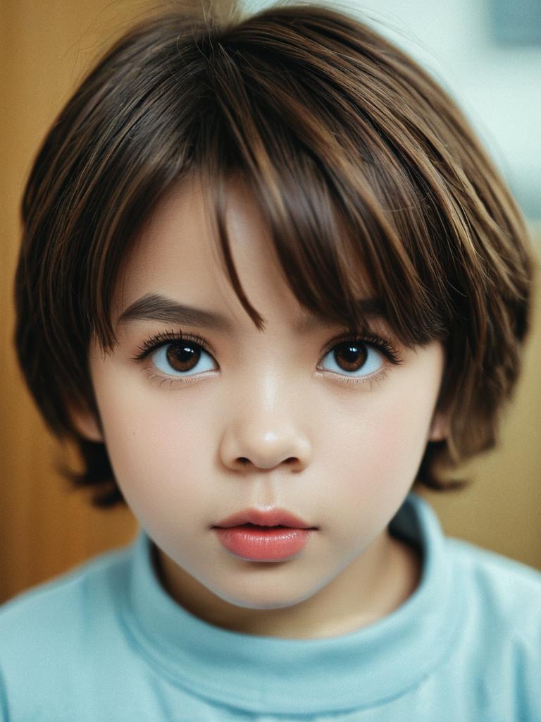 Crazy eyed boy child costume, solo, 1girl, brown hair, realistic, short hair, looking at viewer, blurry, lips, photorealistic, blurry background, closed mouth, upper body