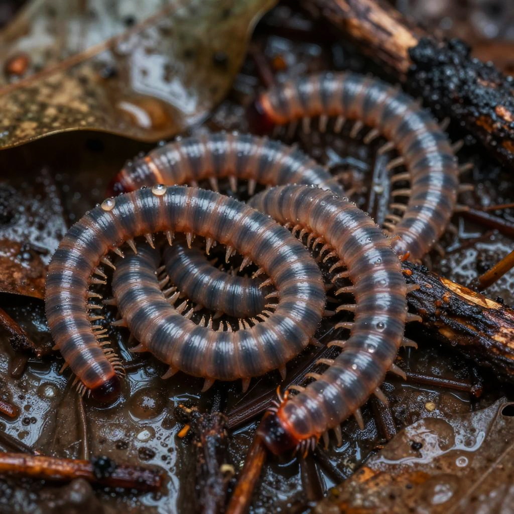 Gusanos intertwining on a wet forest floor during a rainy morning, surrounded by fallen leaves and bits of wood, capturing the moist environment with droplets of water on their glistening bodies, highly detailed macro photography style.