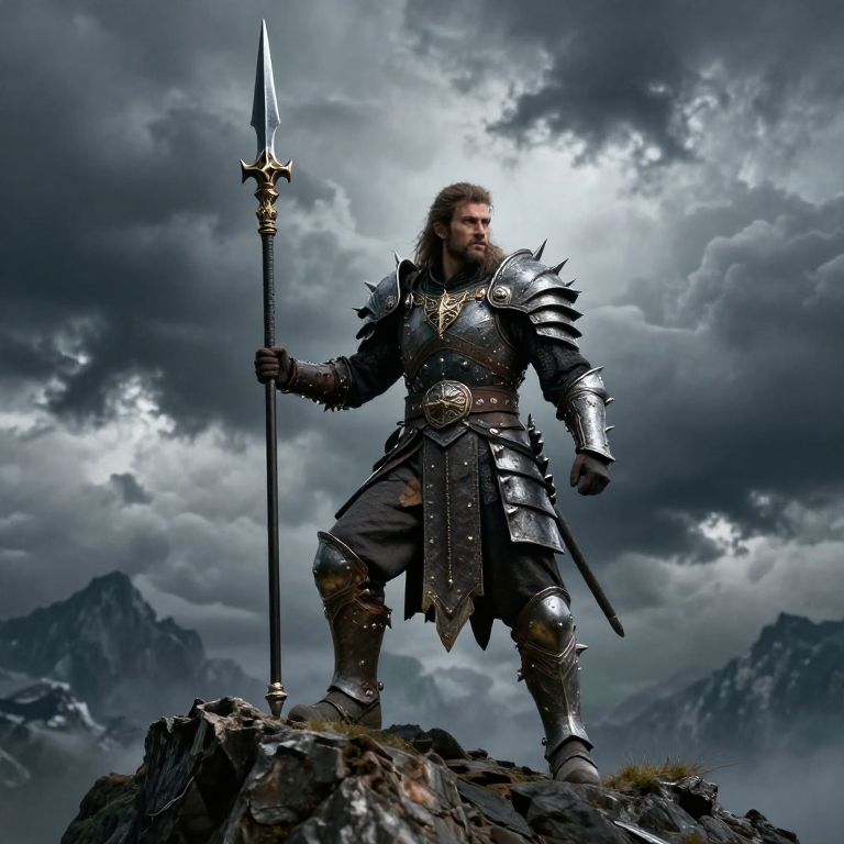 Photorealistic digital artwork of a muscular, bearded Viking warrior in silver armor, holding a long spear, standing on a rocky peak with stormy