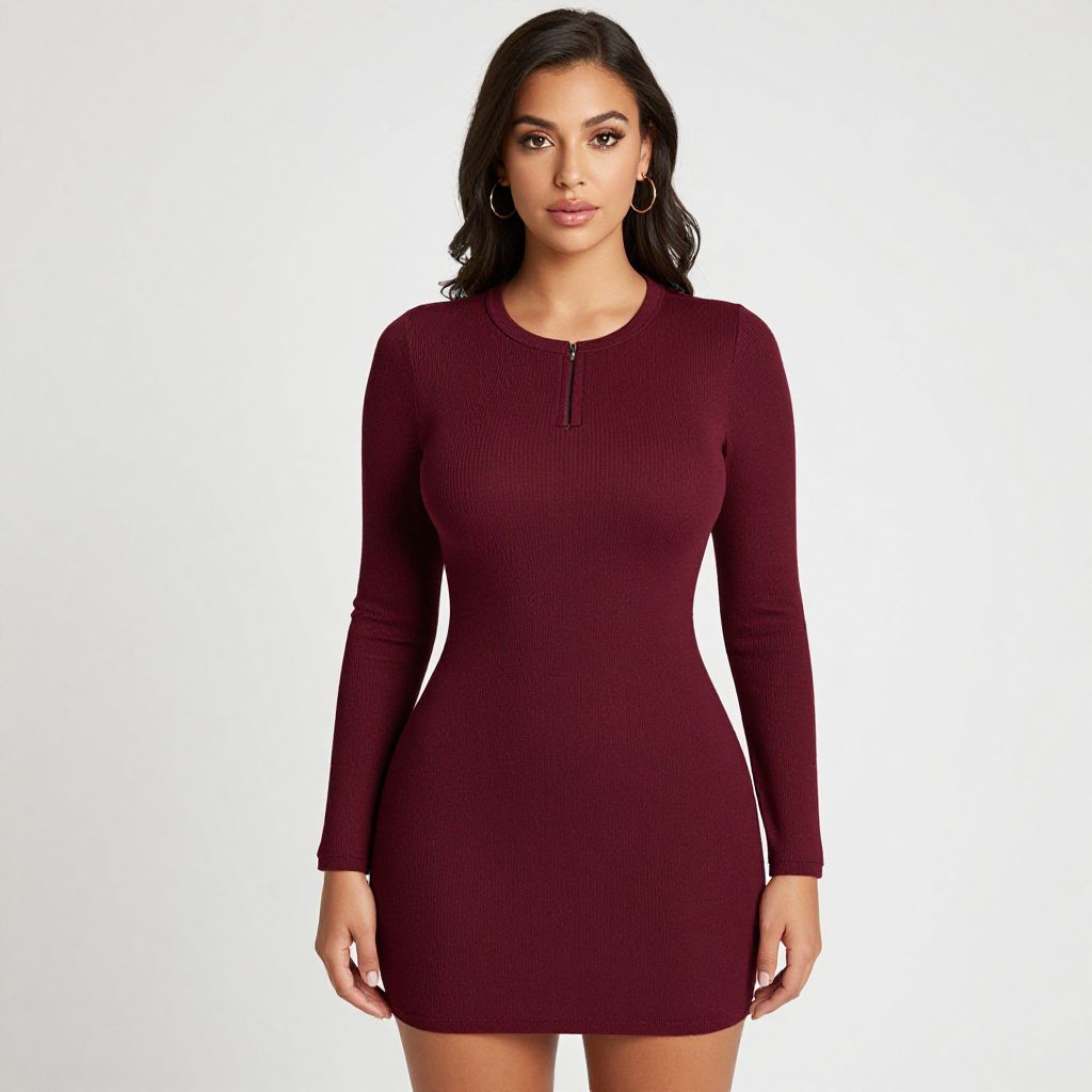 "Woman, body-conscious style, ribbed knit mini dress in maroon, round neckline with a small zipper detail, long sleeves, form-fitting silhouette, hoop earrings, subtle makeup, white studio background.. Sexy. Pretty face and beаutiful eyes. Big breasts."