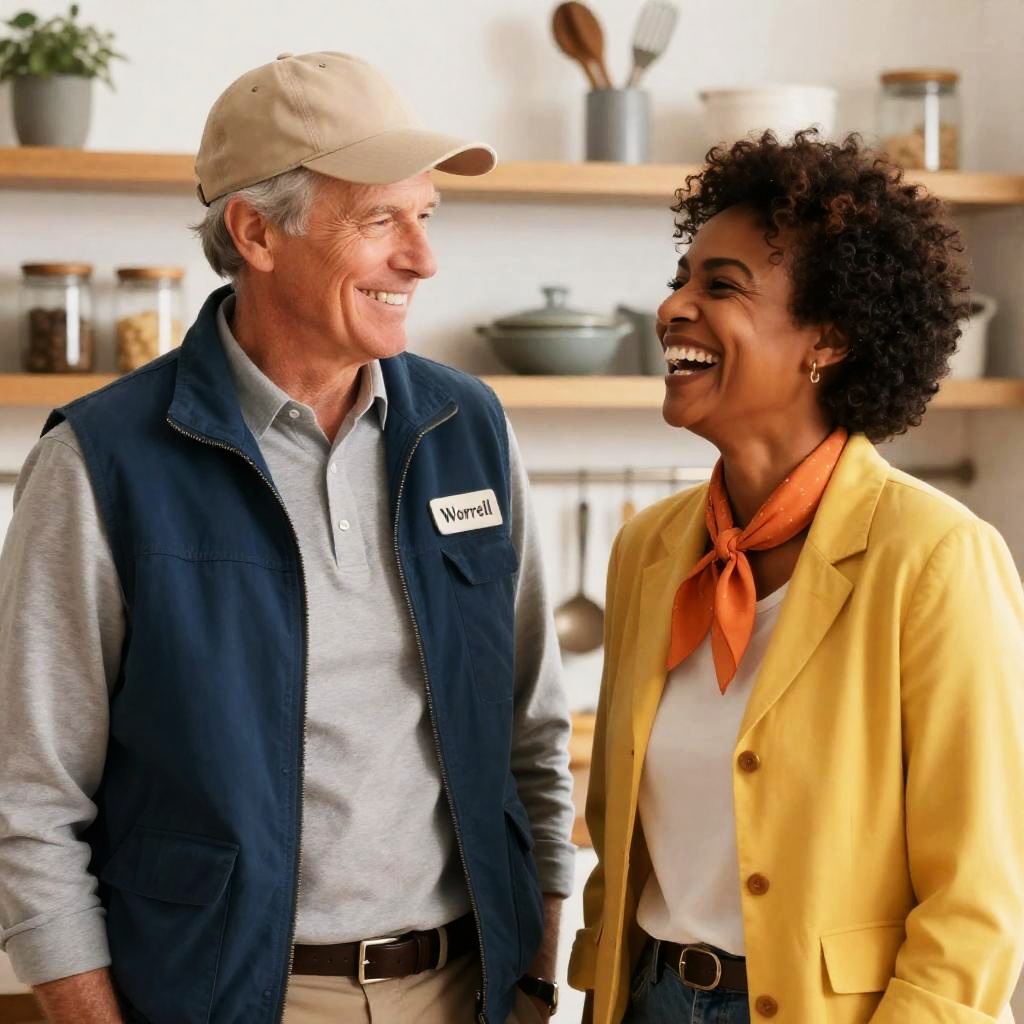 Middle-aged woman with blonde hair, smiling, wearing a light blue sweater and white patterned apron, holds a bowl in a rustic kitchen. Kitchen has wooden countertops, stainless steel sink, pots, pans, blue flowers, and various dishes on the table. Natural light from window. Cozy, homey atmosphere. Woman stands near stove, slightly to the right.