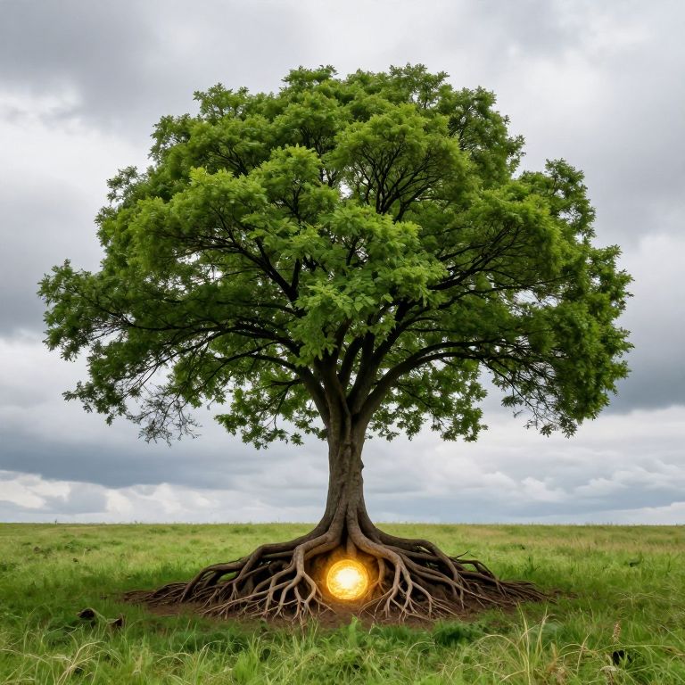 A solitary tree stands majestically against a cloudy sky, its vibrant green canopy spreading wide above a grassy field, while its exposed roots delve deep into the earth, culminating in a radiant golden orb glowing beneath the soil.