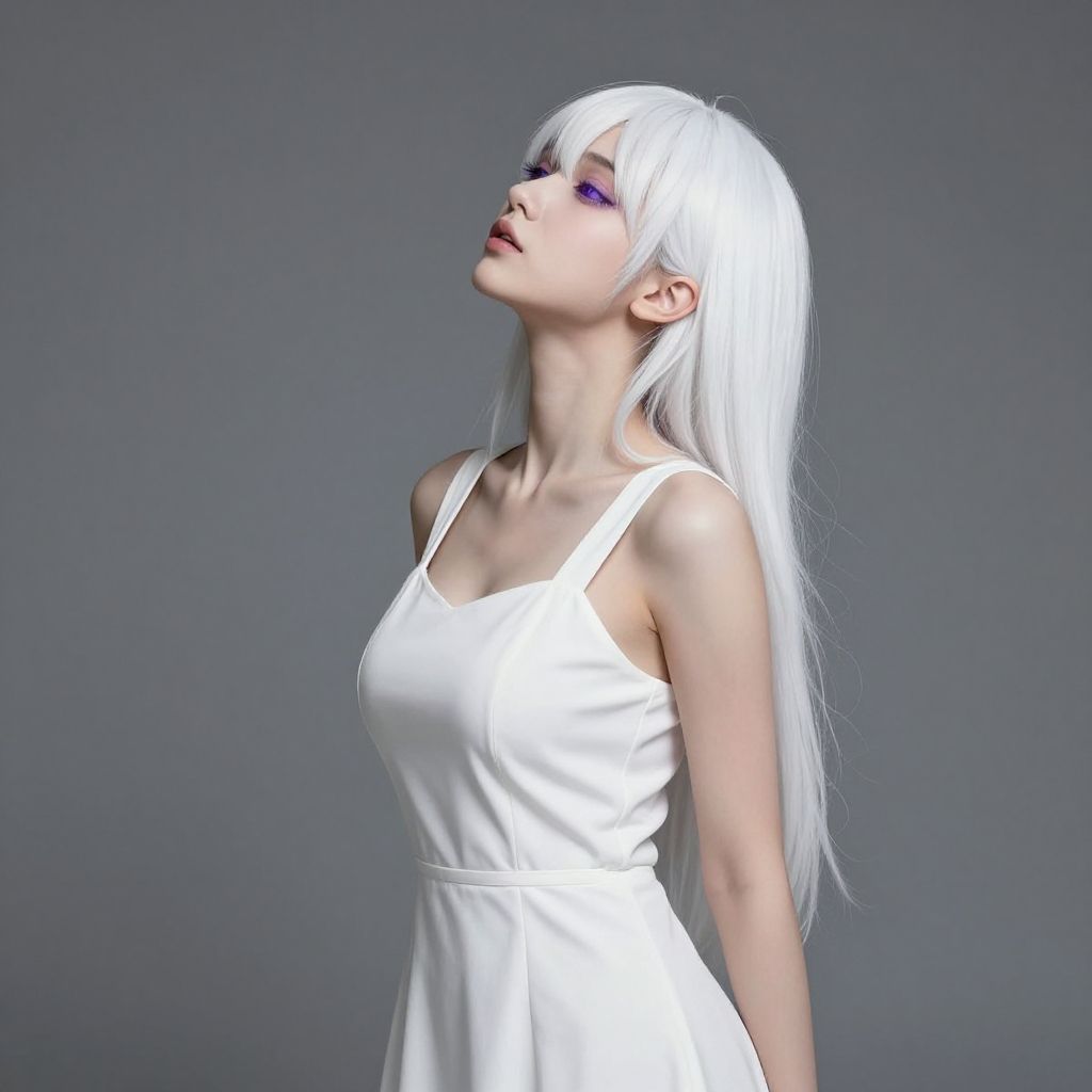 1girl, solo, white hair, (incoming kiss:1.2), purple eyes, dress, sundress, grey background, white dress, medium breasts