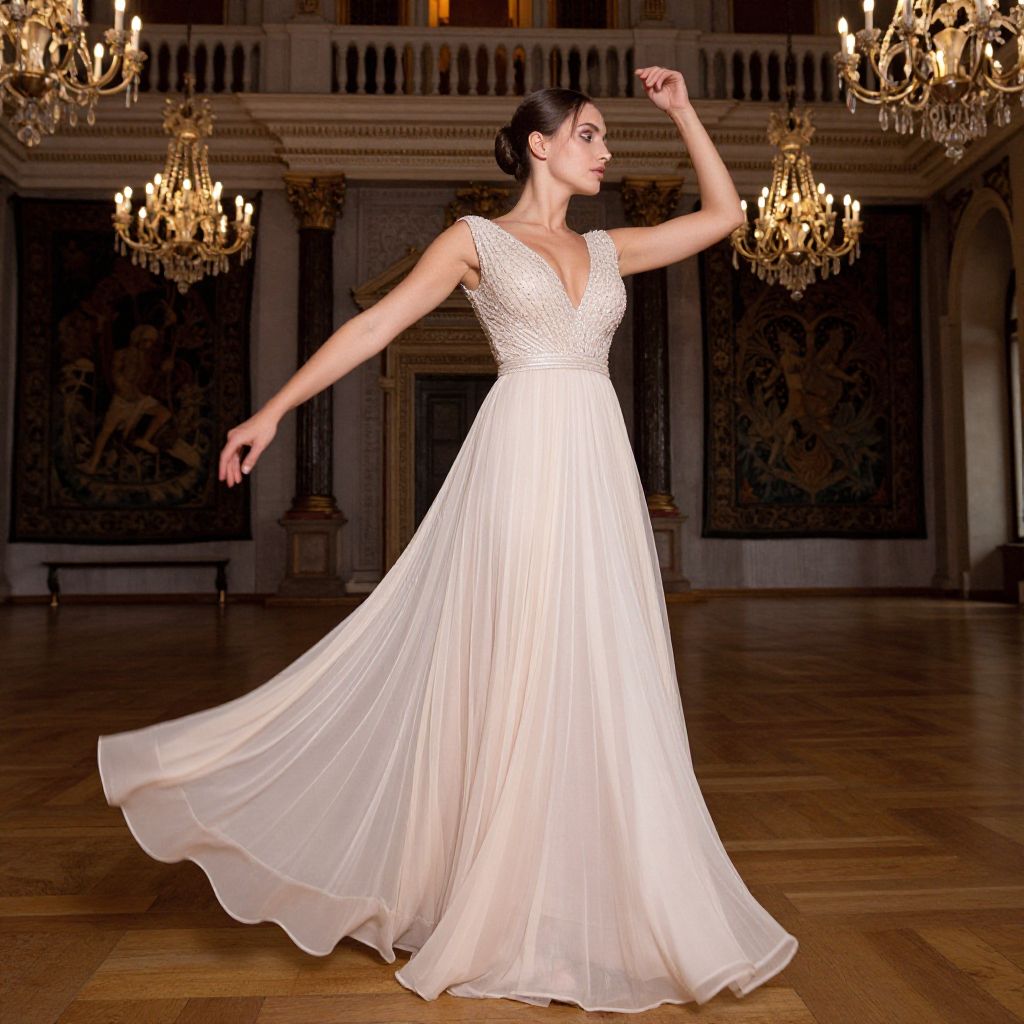 A woman, classic elegance, blush floor-length gown, V-neck, sleeveless, beaded bodice, flowing pleated skirt, sheer overlay, waistband detail, ancient castle ballroom, grand chandeliers, ornate tapestries, dancing gracefully, natural candid, unposed, authentic moment Sexy. Pretty face and beаutiful eyes. Big breasts