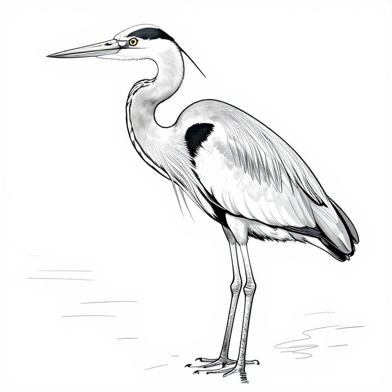 Great blue heron coloring page depicting serene heron perched by water, detailed contour lines highlighting feathers and tall legs, minimalist background for focus on bird