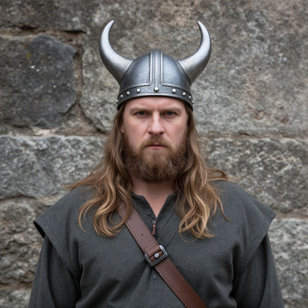 A man with a beard and a viking helmet is standing in front of a stone wall.
