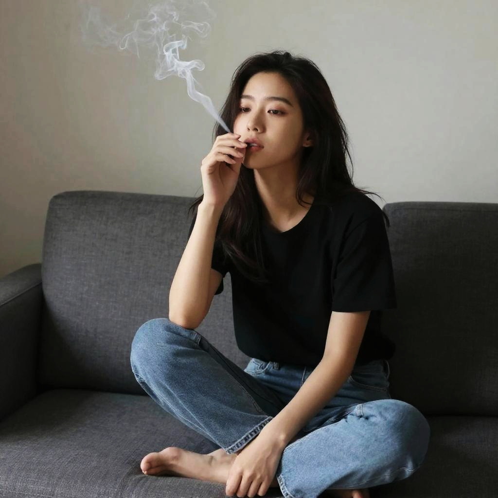 Photograph of an Asian woman with long black hair, sitting cross-legged on a dark gray couch. She wears a black short-sleeved T-shirt and blue jeans, barefoot. She holds a cigarette to her lips, with a wisp of smoke curling upwards. The background is a plain, light gray wall. Her expression is relaxed, with a slight, contemplative gaze. The lighting is natural, highlighting her fair skin and casual attire. The image has a realistic, slightly dramatic style, focusing on her calm demeanor and the contrast between her dark clothing and the light background.