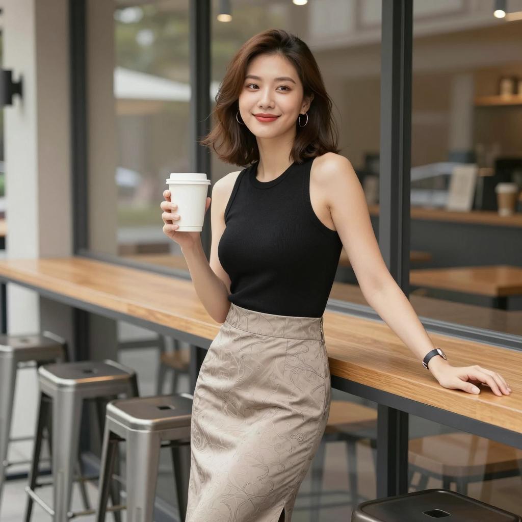Woman drinking coffee and laughing, close-up portrait, Asian woman with long hair tucked behind one ear and soft smile wearing light hoodie layered over tank top posed resting elbows on the table, holding the cup with both hands in bright modern café bar with blurred barista behind, cozy friendly atmosphere, warm tones, high resolution, ultra-detailed