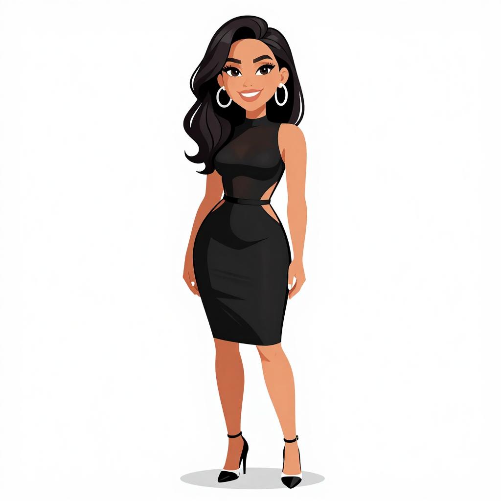 Woman with pretty face and pretty hair. smiling Woman, chic, black midi dress with a v-neck, three-quarter sleeves, front zipper closure that goes down to the thigh-high slit, paired with strappy black high-heeled sandals, accessorized with multiple gold bangle bracelets. --sref 1467
