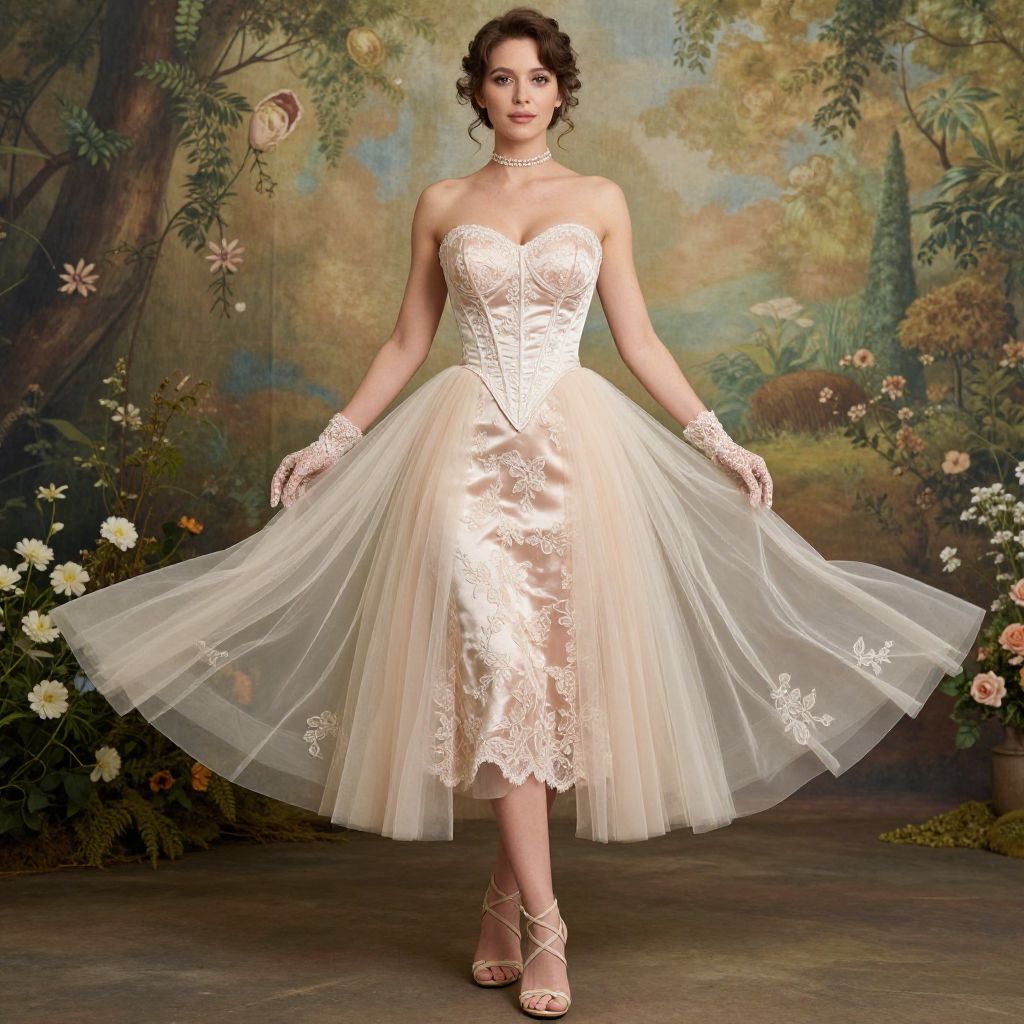 Photograph of a fair-skinned woman with dark curly hair, wearing a strapless, white lace bodice and a full, knee-length tulle skirt with floral lace details. She stands against a painted backdrop of a garden with trees and flowers, holding out her skirt. She wears white lace gloves and strappy beige heels, and a delicate pearl choker. The background includes soft greens, browns, and muted flowers, creating a romantic, vintage atmosphere. Her pose is elegant, with a confident smile.