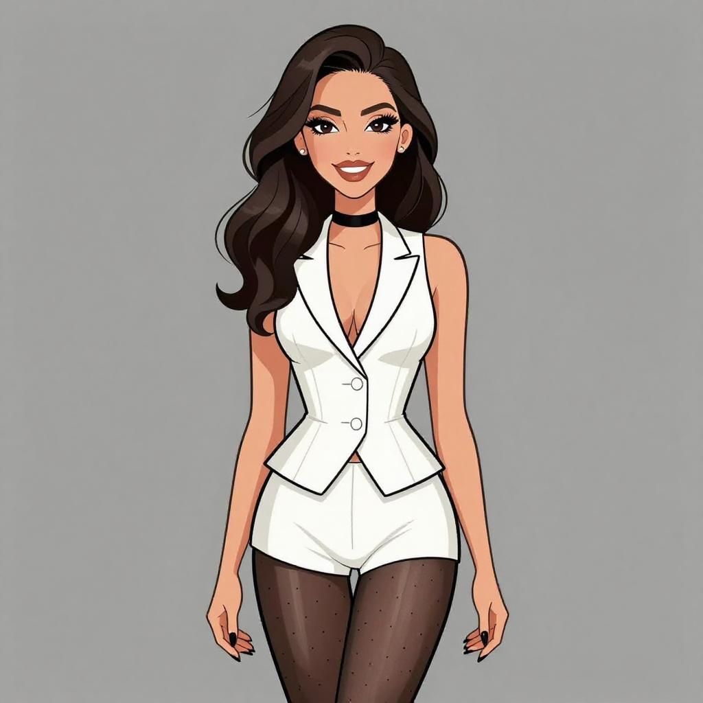 Woman with pretty face and pretty hair. smiling Woman, contemporary chic, white sleeveless tuxedo-inspired playsuit, deep V-neckline, peplum waist detailing, tailored fit, black choker, sheer black polka-dot pantyhose, photo studio background. --sref 1467