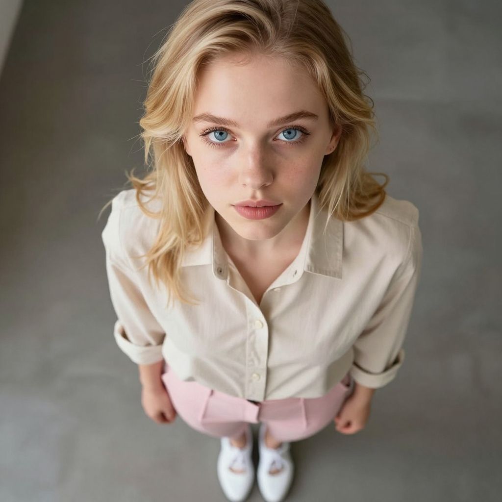 1girl, beige shirt, pink pants, blue eyes, blonde hair, white shoes
