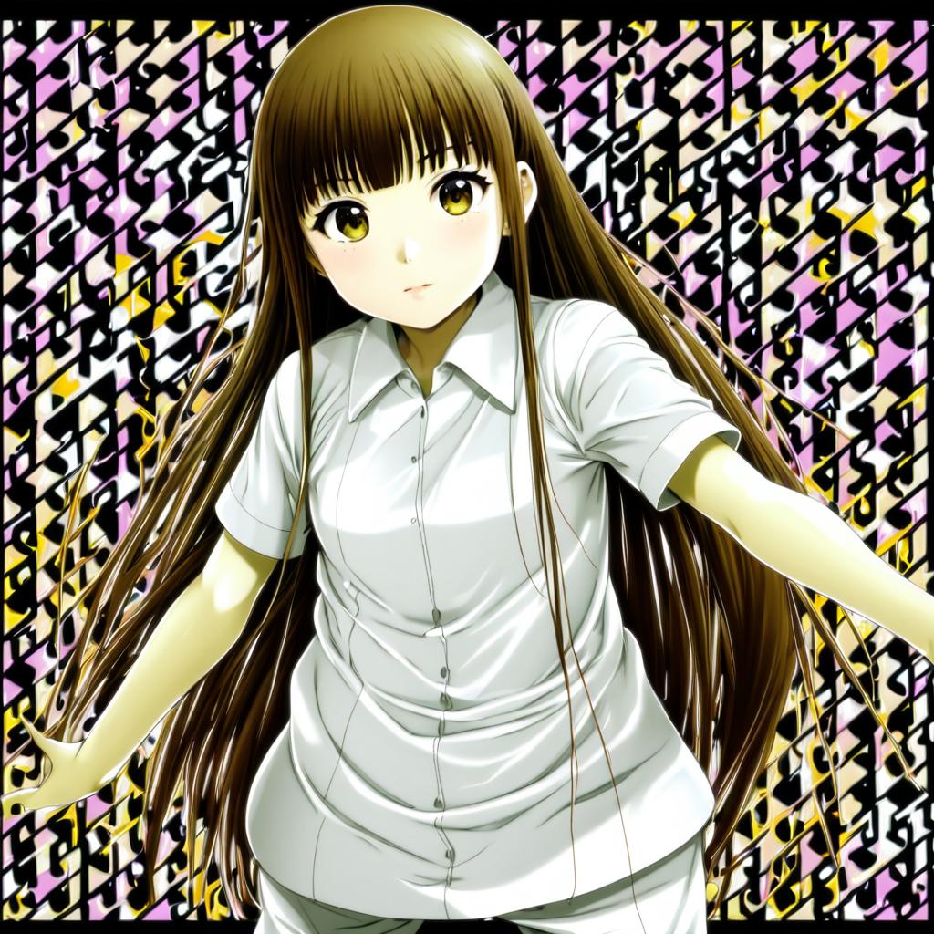 Digital illustration of an anime-style girl with large brown eyes and long brown hair. She is wearing a white school uniform jacket over a white shirt and a dark red tie. The background features a yellow grid pattern, giving the image a modern and bright appearance. The character has a calm and gentle expression.