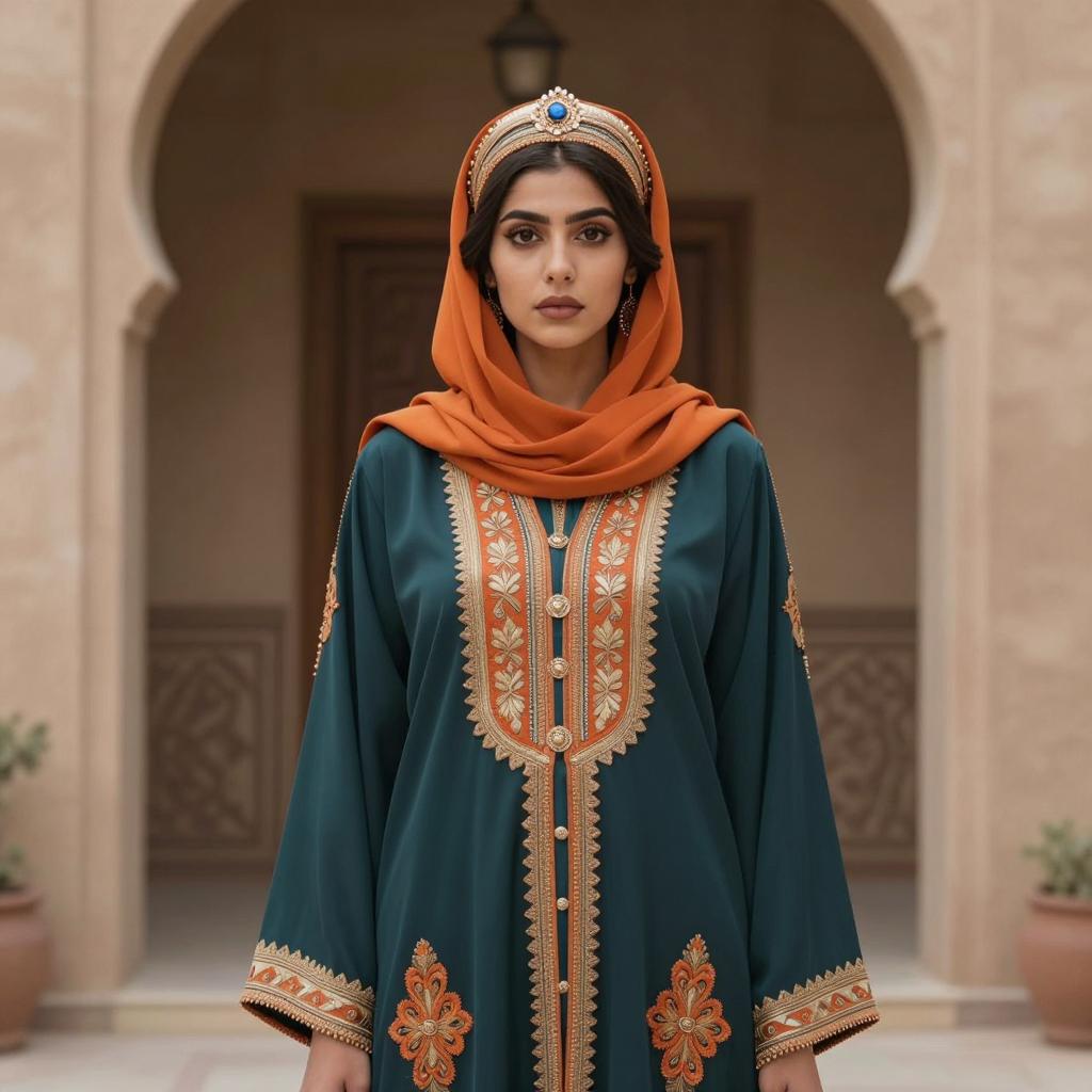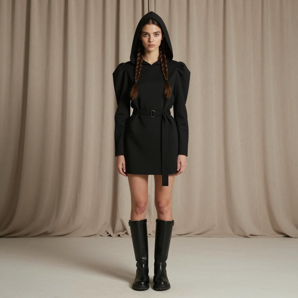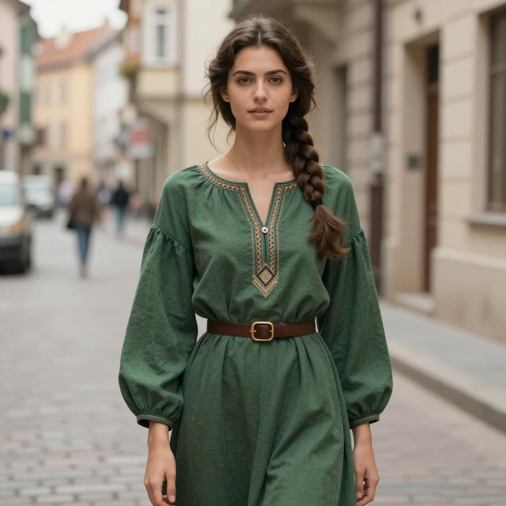Young Woman in Green Hooded Tunic with Pink Ribbon