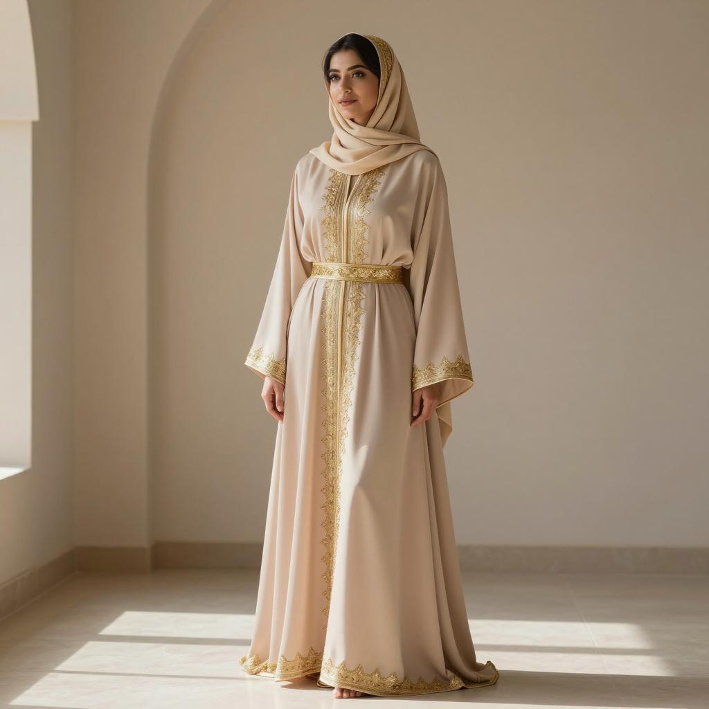 Full-body portrait of a young woman standing in an ornate hallway wearing a green long-sleeve hooded tunic tied with a pink ribbon around her waist. She has a long brown braid, black strappy sandals, and a serious expression. The background features decorative wooden frames and potted plants on either side, with earthy tones and soft natural lighting.