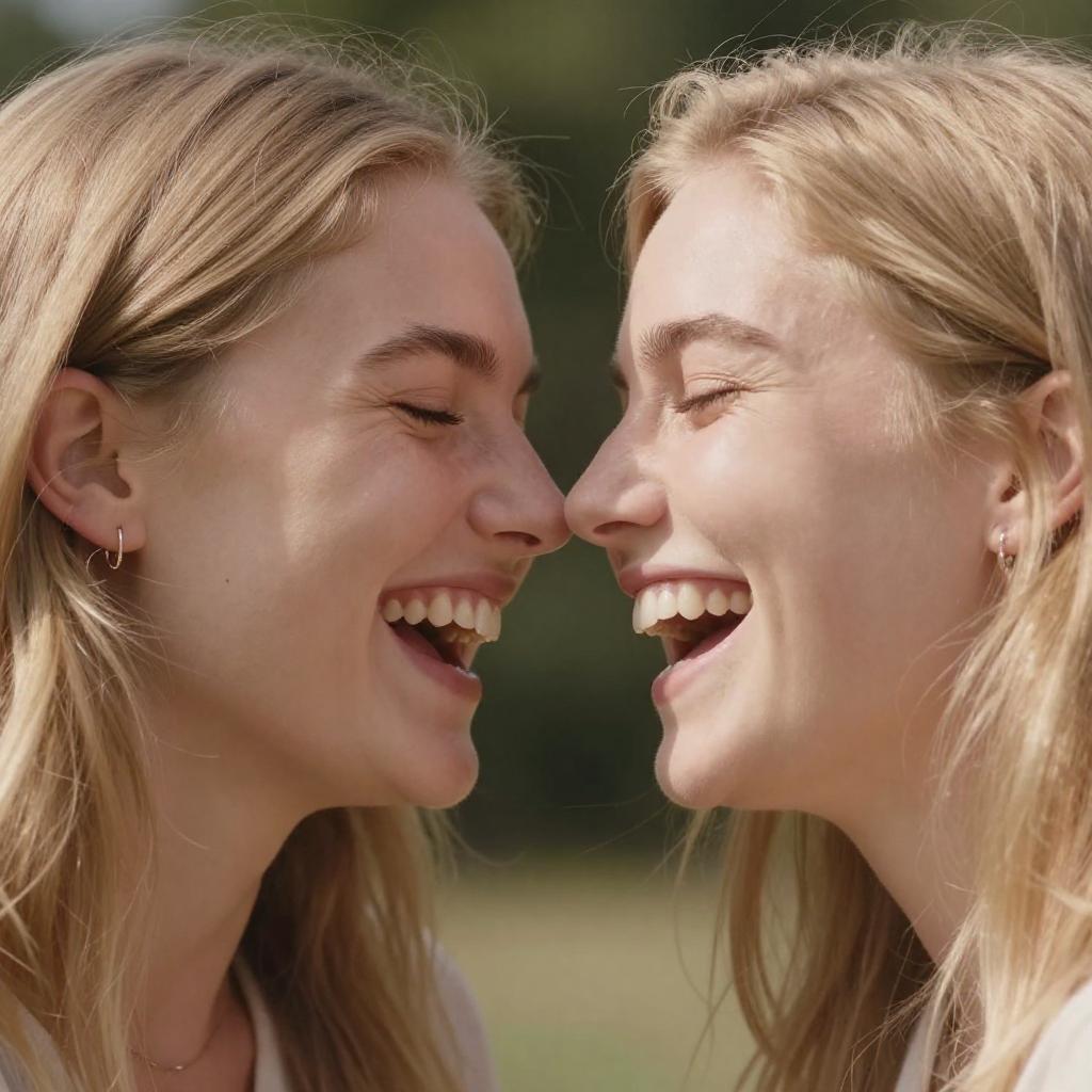 Photograph of two laughing, blonde women with long hair, noses almost touching, eyes closed, and mouths open in joy. The lighting is bright and natural, highlighting their smiling faces. The camera angle is close-up, eye-level, with a shallow depth of field that blurs the background. Their hair strands intermingle, and they both have small earrings. The image captures a moment of pure, shared happiness.