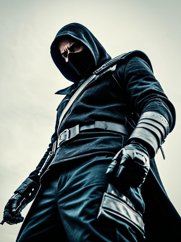 Man in Modern Assassin Costume, cinematic realism, dramatic low-angle portrait