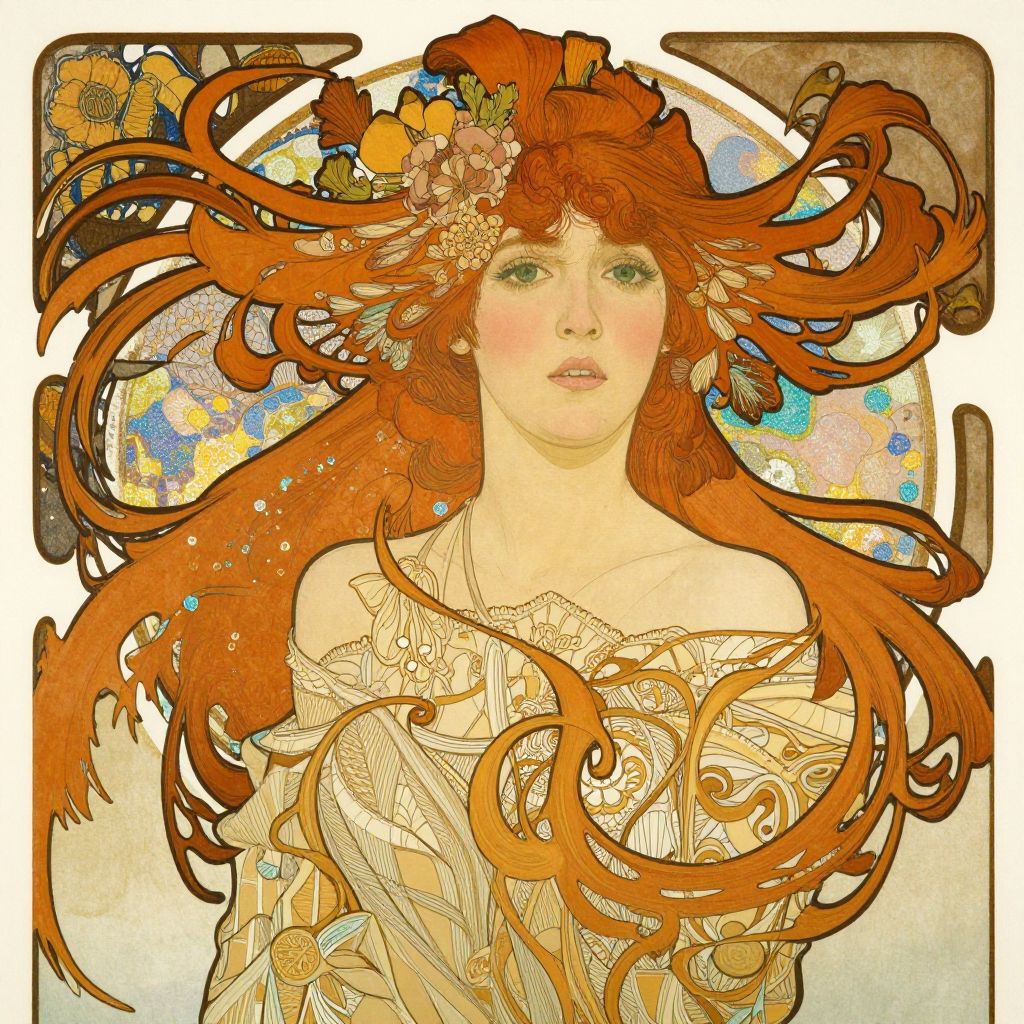 Digital art of a fair-skinned woman with flowing red hair, adorned with flowers, wearing an intricate off-shoulder gown, in an Art Nou