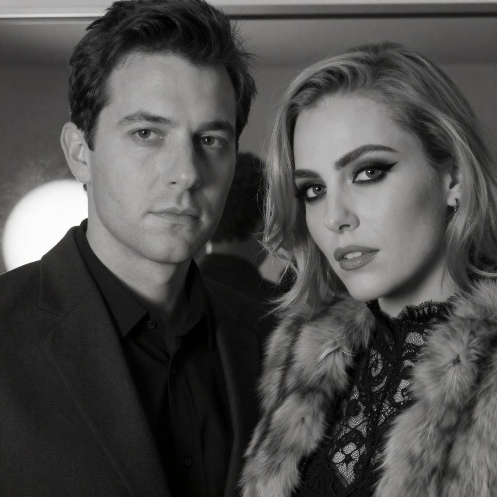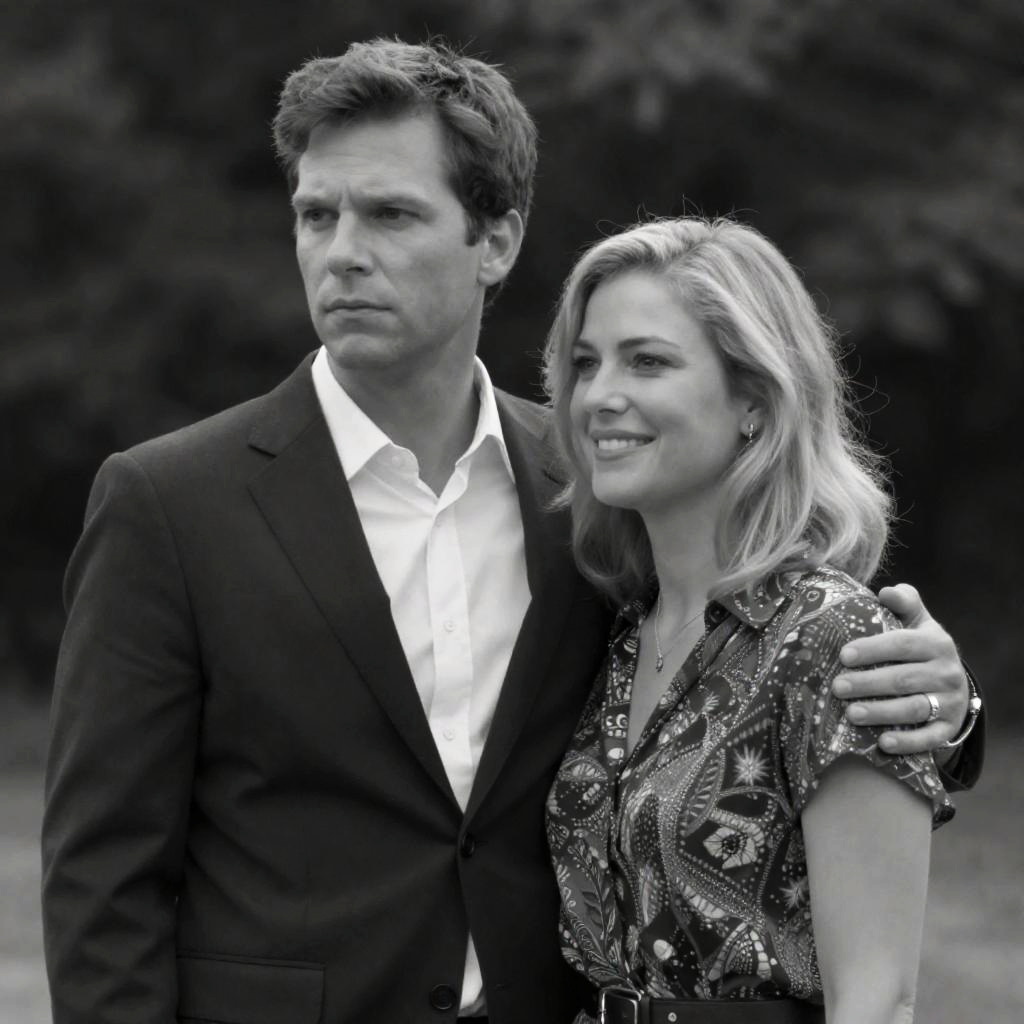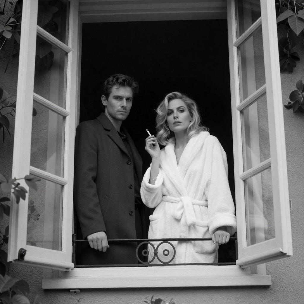 Black and white photograph of a man and woman standing in an open window. Woman with blonde hair in a white robe, holding a cigarette, intense expression. Man in dark overcoat, serious expression, standing to the left. Lush foliage around the window frame. Window shutters partially open. Woman's hand on window frame. Metal railing below.