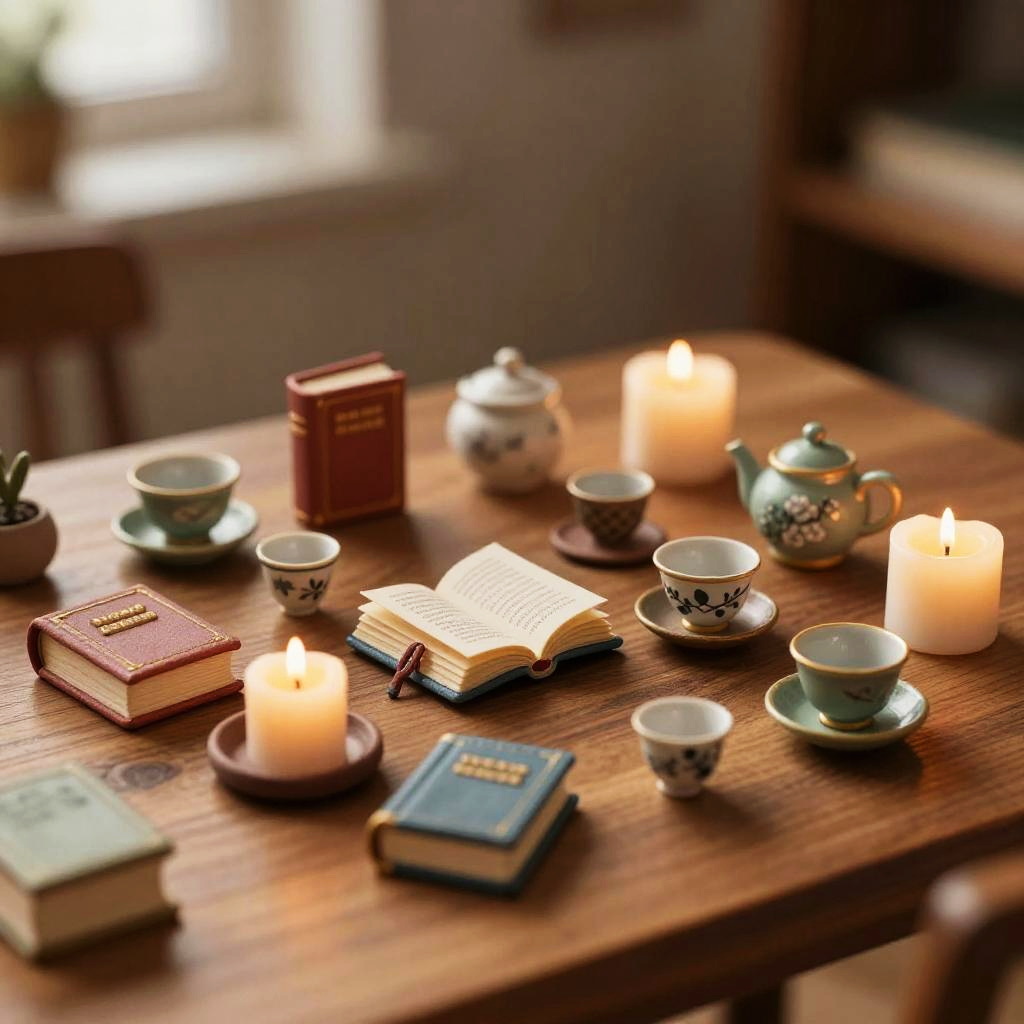 Tinyspo concept art, intricate close-up of tiny handcrafted objects like tiny books, teacups, and candles arranged artfully on a wooden table, warm cozy atmosphere