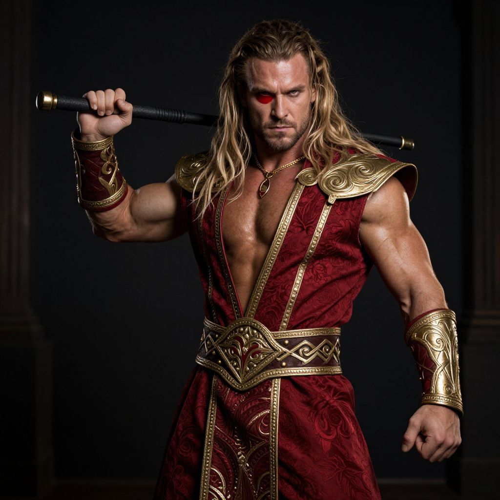 Photograph of a muscular man with long blonde hair, red eyes, wearing a red and gold armored tunic, holding a staff, standing against a
