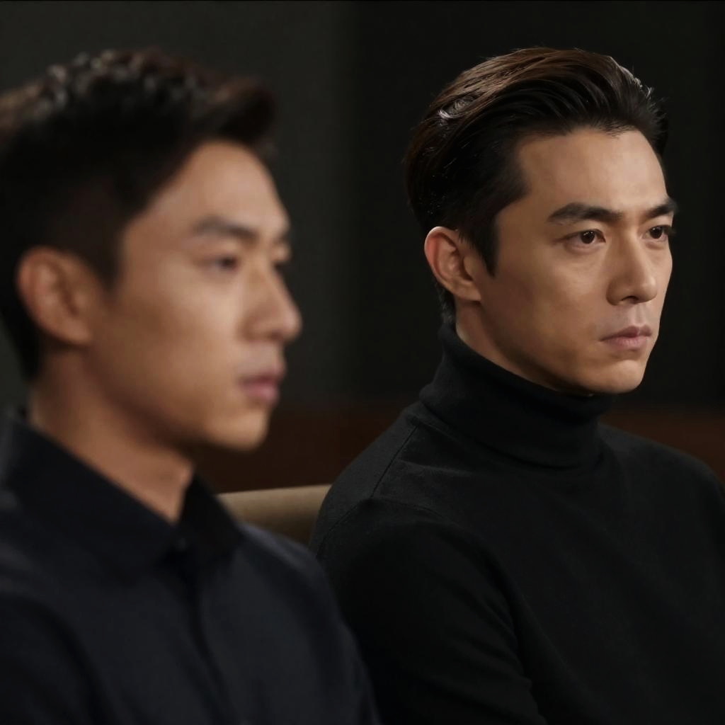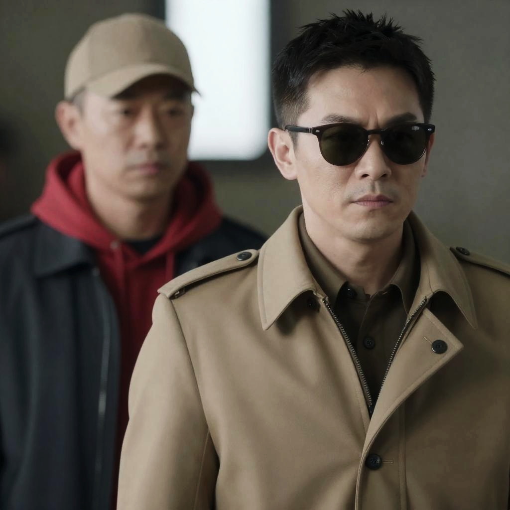 Photograph of two Asian men in a dimly lit indoor setting. The man in the foreground wears dark sunglasses, a tan military-style coat, and has short dark hair with a serious expression. The man in the background wears a beige baseball cap, red hoodie, and dark coat, with a neutral expression and is slightly out of focus. A bright light source is visible behind the background man.