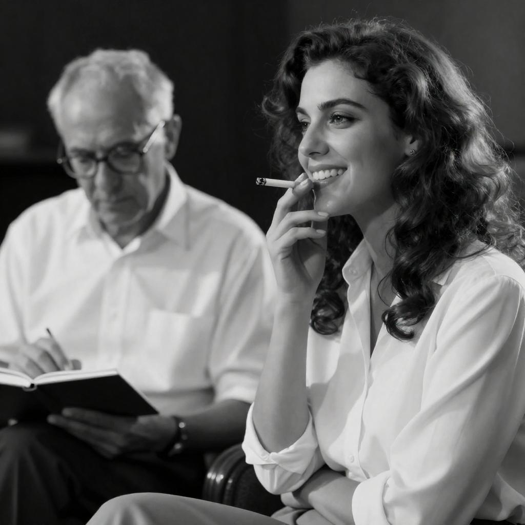 Black-and-white photograph featuring a smiling young woman with wavy hair, dressed in a white blouse, holding a cigarette to her mouth. An elderly man wearing glasses and a white shirt sits beside her, focusing on writing in a notebook. The background is dark and blurred, emphasizing the two subjects.